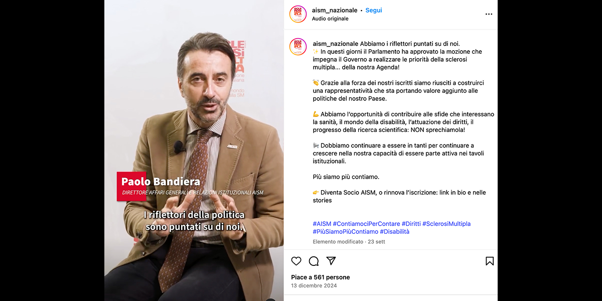 Il tema della rappresentanza, nelle sedi istituzionali e in tutti gli altri contesti, ha assunto negli anni un ruolo sempre più decisivo. La campagna di comunicazione e le attività verticali sui target Soci e Prospect, sviluppati in una logica multicanale, hanno portato l’attenzione sulla centralità e sul valore del Socio e dato una spinta decisiva, in termini numerici, a quel processo di partecipazione e di condivisione che ha conseguenze positive per tutte le persone con SM e i loro familiari. Per la campagna Soci AISM abbiamo sviluppato e declinato su diversi touchpoint soluzioni e strumenti originali e coinvolgenti, che hanno raggiunto i vari target attraverso mailing cartacei, DEM, campagne social, video interviste. Un lavoro trasversale, che attraverso una regia chiara e coordinata è riuscita nell’intento di capitalizzare le diverse azioni e fare emergere in modo distintivo l’identità e il carattere della comunicazione Soci, integrandola con i codici di comunicazione AISM e facendole diventare una cosa sola.